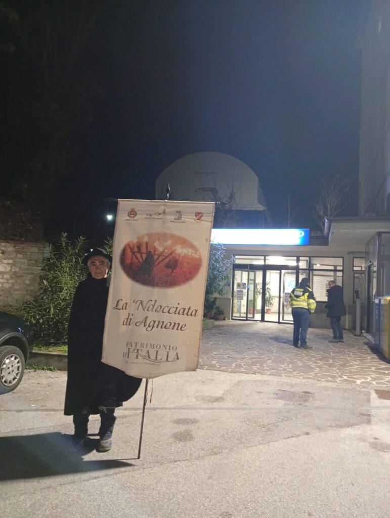 Quest’anno, però, una novità si è fatta spazio sui ciottoli delle strade del paesino, dove le cappe nere sono state accompagnate da un fiocco bianco chiuso da un cerotto a decorare i petti degli “‘ndocciatori”. Si è trattato di un segno di solidarietà e di lotta a favore dell’ospedale Caracciolo, la cui attività è sempre più a rischio a seguito della chiusura della quasi totalità dei reparti che vi si trovano all’interno.