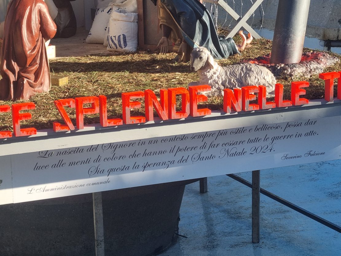 “La nascita del Signore, in un contesto sempre più ostile e bellicoso- si legge sotto al presepe- possa dare luci alle menti di coloro che hanno il potere di far cessare tutte le guerre in atto. Sia questa la speranza del Santo Natale 2024”.Sicuramente si tratta di un messaggio di pace. Ma dal sapore anche molto confessionale che richiama alla religione cattolica.