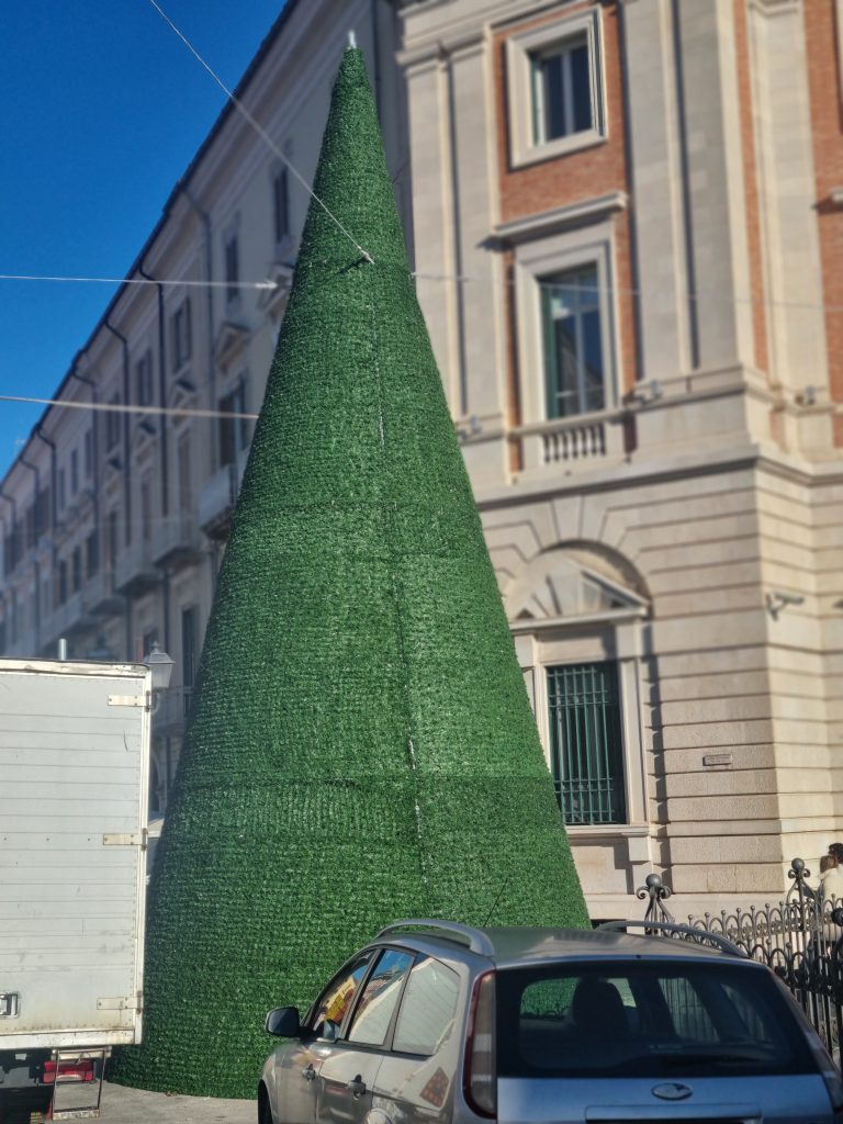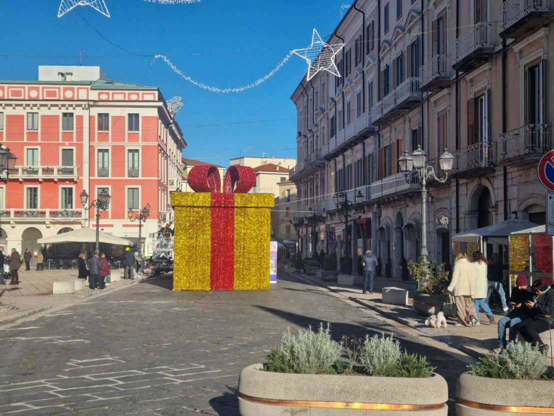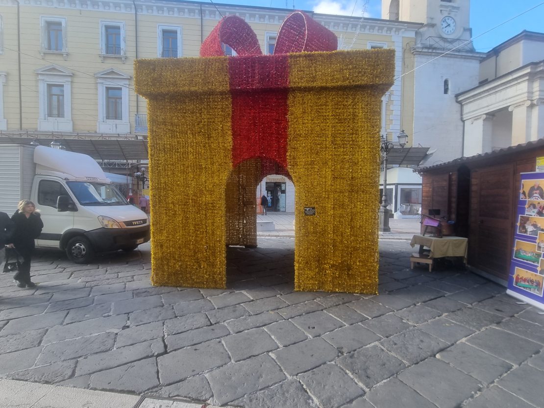 A pochi metri a Piazza Pepe il Natale consumistico. Un Albero di Natale vicino a Gabriele Pepe tutto verde. A pochi metri un pacco regalo in cui è possibile anche entrare e poi i mercatini di Natale. All’ allestimento di questa piazza ha contribuito anche la Regione Molise.