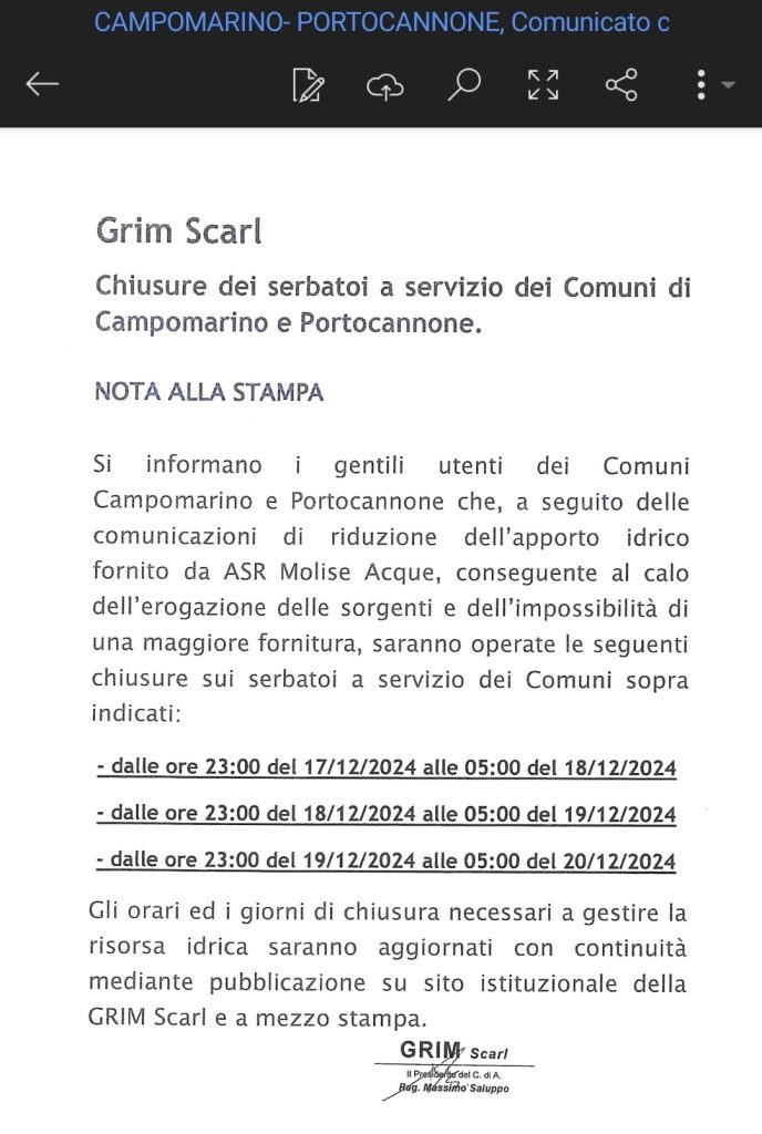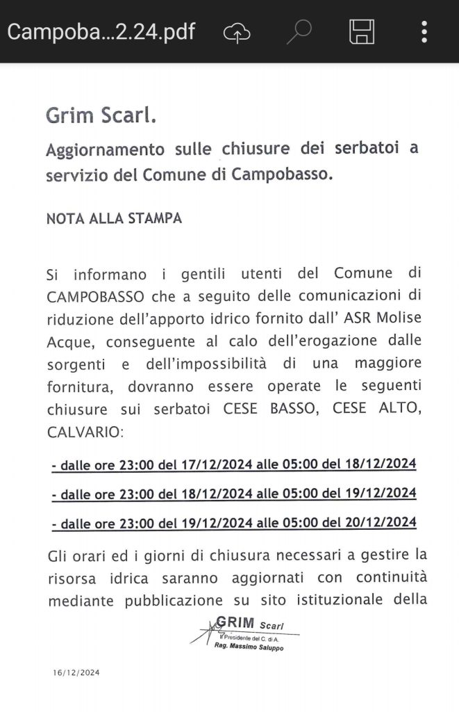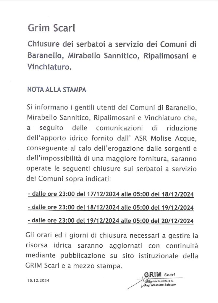 Da oggi alle 23 fino al 20 dicembre alle 5 nei Comuni di Campobasso, Mirabello, ,Baranello, Vinchiaturo, Ripalimosani, Campomarino e Portocannone verranno rispettate le solite chiusure notturne tranne che nelle zone servite dal serbatoio Monforte di Campobasso.