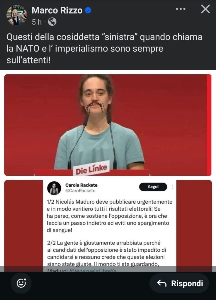 Qui parla di Carola Rackete e sostiene “Questi dalla cosiddetta “sinistra quando chiama la Nato sono sempre sull’ attenti”. Fingendo di lottare contro quel sistema in realtà pubblica una foto di una donna che mai si è dichiarata uomo, la denigra mettendole i baffi.