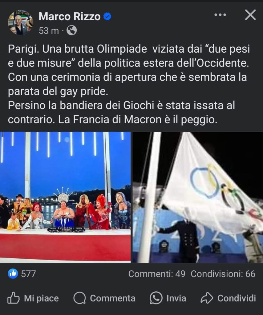 Qui siamo ai tempi delle Olimpiadi. ” Parigi. Una brutta Olimpiade viziata dai due pesi e due misure” della politica estera dell’Occidente. Con una cerimonia di apertura che è sembrata la parata del Gay pride. Persino la bandiera dei giochi è stata issata al contrario. La Francia di Macron è il peggio”.