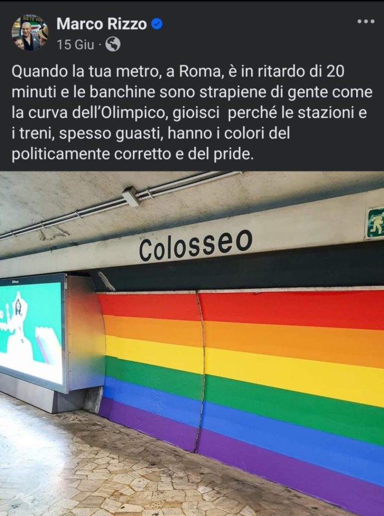 E qui ancora contro il mondo lgbt. “Quando la tua metro a Roma è in ritardo di 20 minimo e le banchine sono strapiene di gente come la curva dell’ Olimpico, gioisci perché le stazioni e i treni spesso Guasti, hanno il colore del politicamente corretto e del pride”.