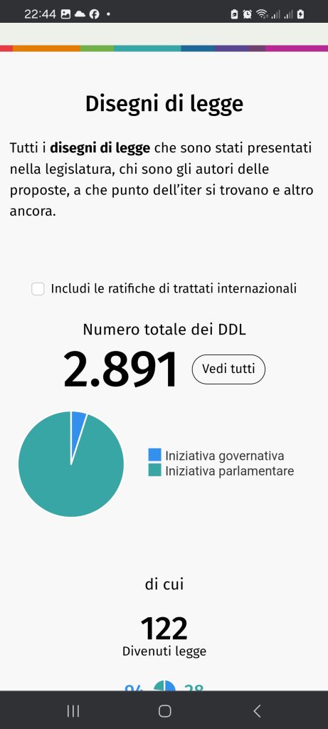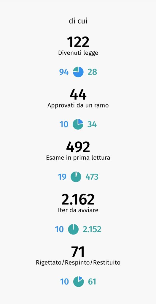 Dall’inizio della legislatura sono 2891 i disegni di legge presentati. Di questi il 95,1% di iniziativa parlamentare ( 2748). Il resto sono di iniziativa governativa. Di questi 122 sono divenuti legge ( 94 del parlamento e 28 del Governo), 44 sono stati approvati da un solo ramo del parlamento (34 drl parlamento e dieci di iniziativa governativa). Di questi 492 sono in esame di prima lettura e 2162 iter da avviare. Fin qui i dati nazionali.