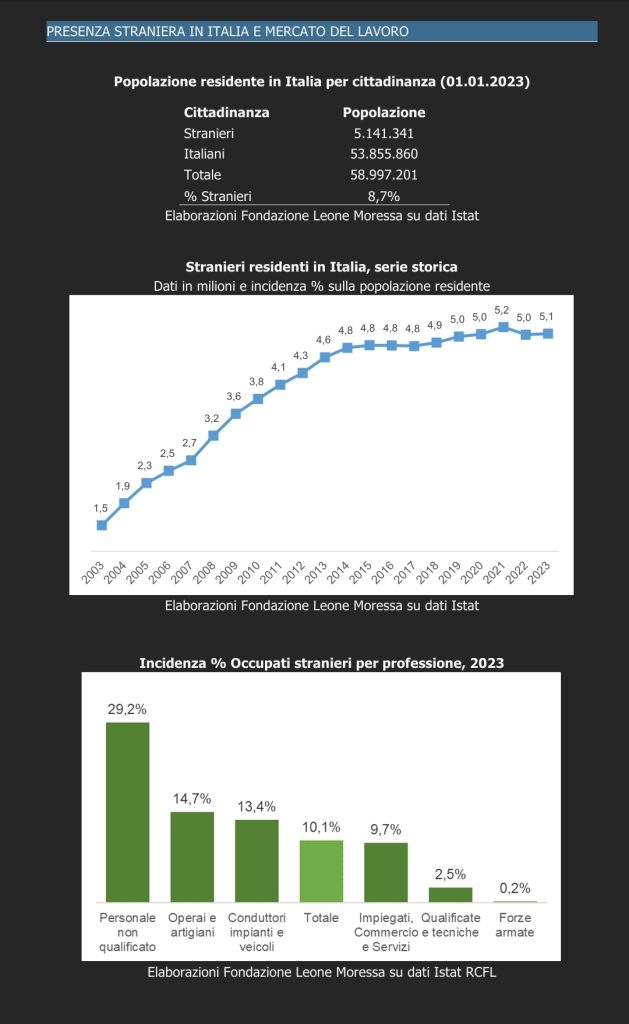 Sono i numeri principali delle analisi del Rapporto annuale 2024 sull’economia dell’Immigrazione, curato dalla Fondazione Leone Moressa e presentato oggi al Viminale e alla Camera dei Deputati.