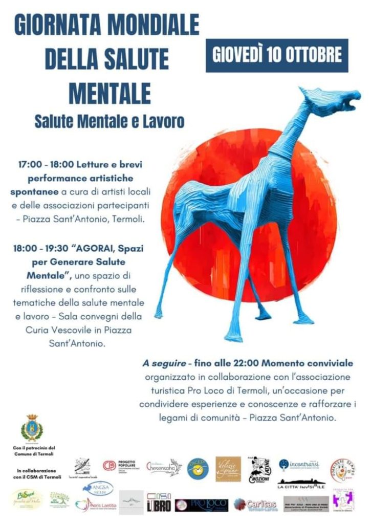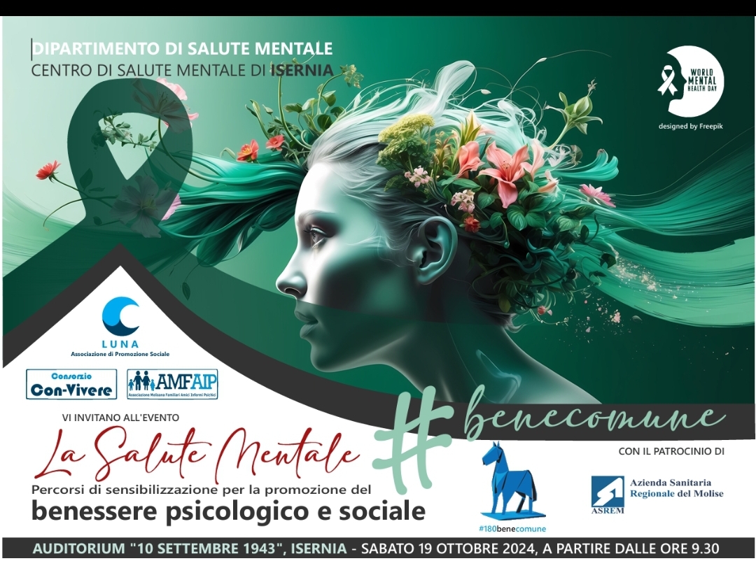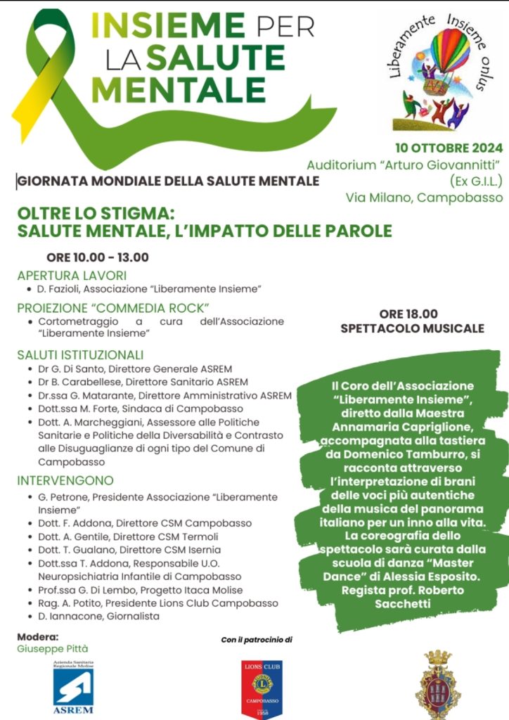 Anche in Molise, grazie ad Asrem, si celebra la giornata della salute mentale. Come si può vedere dalle fotografie allegate le prime due iniziative, di concerto con i Comuni e con le associazioni sul territorio, si svolgeranno a Campobasso nei locali dell’ ex Gil e a Termoli. Si chiude il 19 ottobre all’auditorium di Isernia.