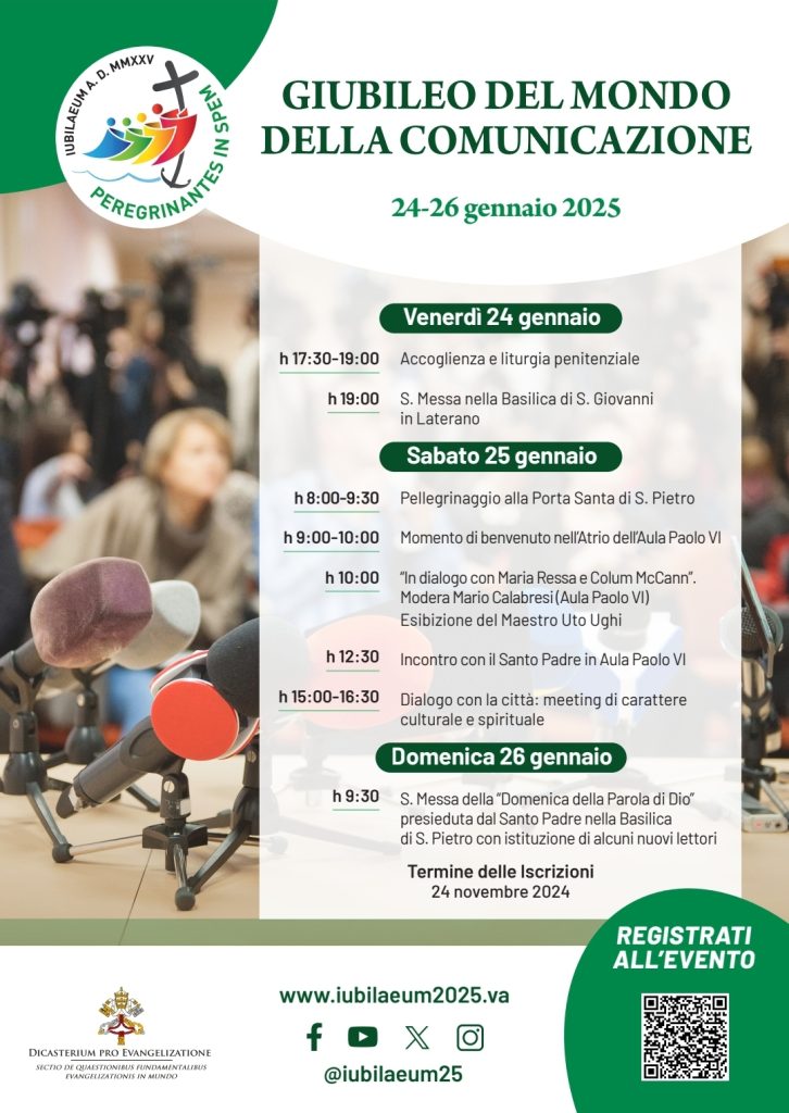Il Giubileo dei comunicatori inizierà nel pomeriggio di venerdì 24 e si concluderà la mattina di domenica 26 gennaio con la Santa Messa nella Basilica di san Pietro presieduta da Papa Francesco.
