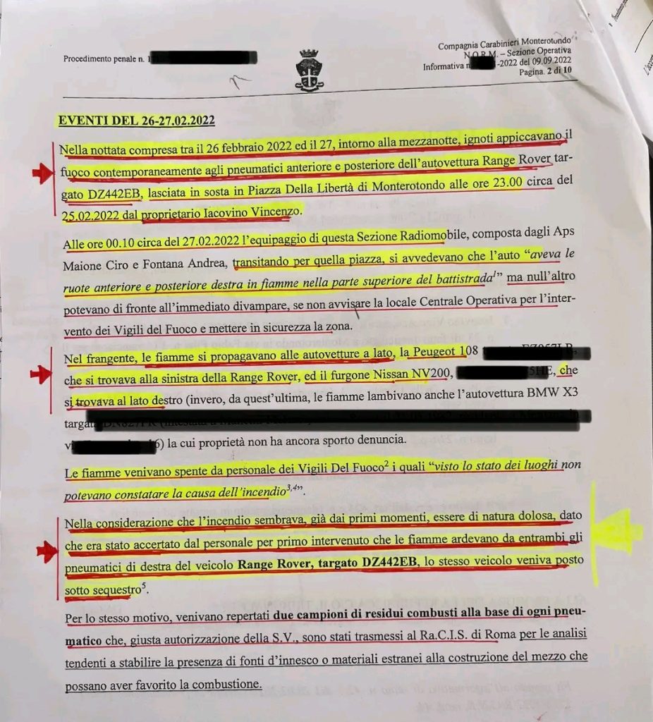 ” È stato un attentato – dichiara Fiorato- contro chi da anni denuncia il malaffare di gruppi d’interessi malavitosi, la malamovida, lo spaccio di droga, la vendita di fiumi di alcool a qualsiasi ora su suolo pubblico con tanto di musica interna ed esterna ai locali, le risse violente con percosse e lesioni gravissime, il disturbo continuo della quiete pubblica da parte di alcuni gestori di pubblici esercizi e di violenti avventori ubriachi, l’occupazione del suolo pubblico oltre ogni limite e in alcuni casi in assenza di concessione, gli eventi e le pubbliche manifestazioni in assenza di autorizzazione, il degrado urbano, l’assenza di controllo da parte della polizia locale, le gravi inadempienze dell’amministrazione comunale, le gravi minacce ricevute.L’incendio che il 27 febbraio del 2022 ha distrutto la nostra automobile è stato doloso.** **A sottolinearlo i Carabinieri della Compagnia di Monterotondo nel verbale di intervento di quella notte: “in data odierna alle ore 00:10, mentre uscivamo dalla carraia del Comando per intraprendere il servizio perlustrativo, notavamo che un’autovettura parcheggiata in piazza della Libertà marca Range Rover targata DZ442EB aveva le ruote anteriore e posteriore destra in fiamme nella parte superiore del battistrada. In attesa dell’arrivo dei vigili del fuoco prevedevamo a contattare alcuni proprietari delle autovetture parcheggiate vicino all’auto in fiamme…. Nonostante i tentativi di spostare le autovetture l’incendio colpiva altri tre veicoli”.I Carabinieri della Compagnia di Monterotondo nella loro relazione conclusiva del 9 settembre 2022, inviata alla Procura della Repubblica presso il Tribunale di Tivoli, dopo aver evidenziato che: “ignoti nella notte tra il 27 e il 28 febbraio 2022 appiccavano il fuoco contemporaneamente ai pneumatici anteriori e posteriori del lato destro della Range Rover di proprietà dell’avv. Vincenzo Iacovino”, hanno sottolineato che “l’incendio che ha dato luogo al danneggiamento delle autovetture è ritenuto sicuramente di natura dolosa stante la testimonianza dei Militari per primi intervenuti”.Hanno bruciato la nostra macchina ma non la nostra dignità né la nostra determinazione.Abbiamo combattuto e continueremo a combattere per la legalità e il bene comune e i fatti ci stanno dando ragione. Continueremo a far valere le nostre ragioni e le ragioni della giustizia, della civiltà e del rispetto della legge, in ogni sede. E naturalmente vi terremo informati su ogni sviluppo”.