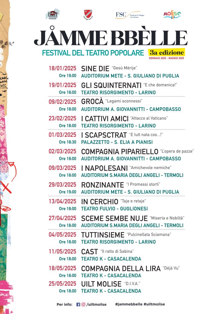 Dal 18 gennaio al 25 maggio, da San Giuliano di Puglia e Casacalenda: saranno ben 14 gli spettacoli in programma che coinvolgeranno 7 diverse località molisane: oltre le due appena citate, Campobasso, Larino, Termoli, Guglionesi e Sant’Elia a Pianisi. Le aree interne, come sempre, in prima linea perché lo spirito della manifestazione è portare la bellezza del teatro e della cultura ovunque e in periodo dell’anno di solito avaro di iniziative e appuntamenti di rilievo.