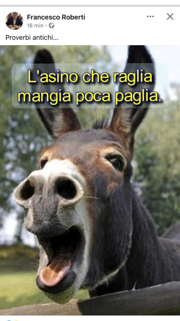 Con la frase: l’ asino che raglia mangia poca paglia. Obiettivo? Far ridere o distogliere l’ attenzione? Da verificare. Intanto l’ effetto Montaruli colpisce anche il Molise.