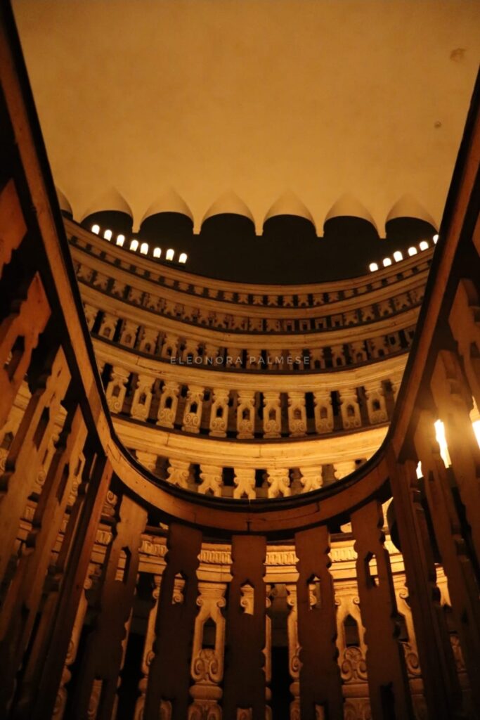 La struttura si presenta con la forma di un cono rovesciato in legno e sfoggia balaustre decorate, oggi piacevoli alla vista ma all’epoca utili per impedire agli studenti più impressionabili di cadere da diversi metri di altezza in caso di svenimenti. Il teatro anatomico fu mantenuto in funzione per quasi tre secoli. Accanto ad esso, sorgeva poi l’imponente aula preposta alle lezioni teoriche di medicina, conservata con il maestoso aspetto del tempo e deputata alla discussione delle tesi di laurea.