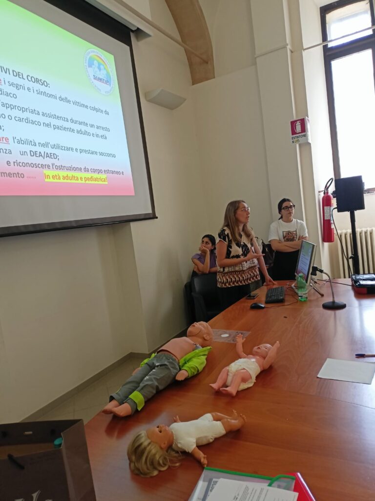 Dopo la parte teorica, i presenti sono stati impegnati sul campo, testando le conoscenze acquisite riguardo le tecniche di rianimazione e di disostruzione delle vie aeree su manichino pediatrico.