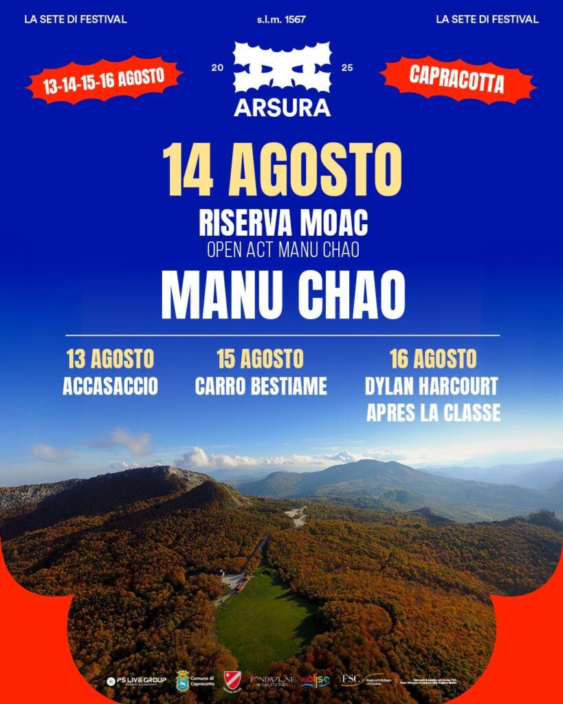 Capracotta, 13 giugno 2025 – Sarà Manu Chao il nome di punta di Arsura Festival, l’evento in programma nella bellissima area di Prato Gentile, a Capracotta, dal 13 al 16 agosto prossimi. L’artista, impegnato in un tour mondiale (in questi giorni è in Francia, poi sarà in Spagna) annuncia oggi il suo atteso ritorno live in Italia con una manciata di concerti e tra questi ci sarà quello ‘in quota’ in Alto Molise previsto per il 14 agosto. I biglietti per il concerto saranno in vendita dalle 14 di oggi, venerdì 13 giugno, su Ticketone e Ciaotickets e nei punti vendita abituali. Evento nell’evento: ad aprire il live di Manu Chao a Capracotta sarà la Riserva Moac, popolarissima band molisana. Il festival, con la direzione artistica di PS Live Group e realizzato in collaborazione con Regione Molise e Comune di Capracotta, avrà inoltre anche un altro ospite internazionale, il cantautore irlandese Dylan Harcourt, che si esibirà il 16 agosto insieme ad una formazione italiana amatissima dal pubblico, gli Apres La Classe, mentre il 13 e il 15 agosto la line up prevede i concerti di Accasaccio e Carro Bestiame. Con l’unica eccezione del 14 agosto (Manu Chao) tutti gli eventi in programma saranno gratuiti. Gli show saranno tutti di pomeriggio mentre ogni giorno ci saranno dj set a partire dal mattino. Perché Arsura Festival? Arsura, in dialetto, è quella sete che ti prende dentro, che non è solo d’acqua, ma di emozioni, di musica, di bellezza. È la sete di cultura, non di bottiglia, sete di festival.