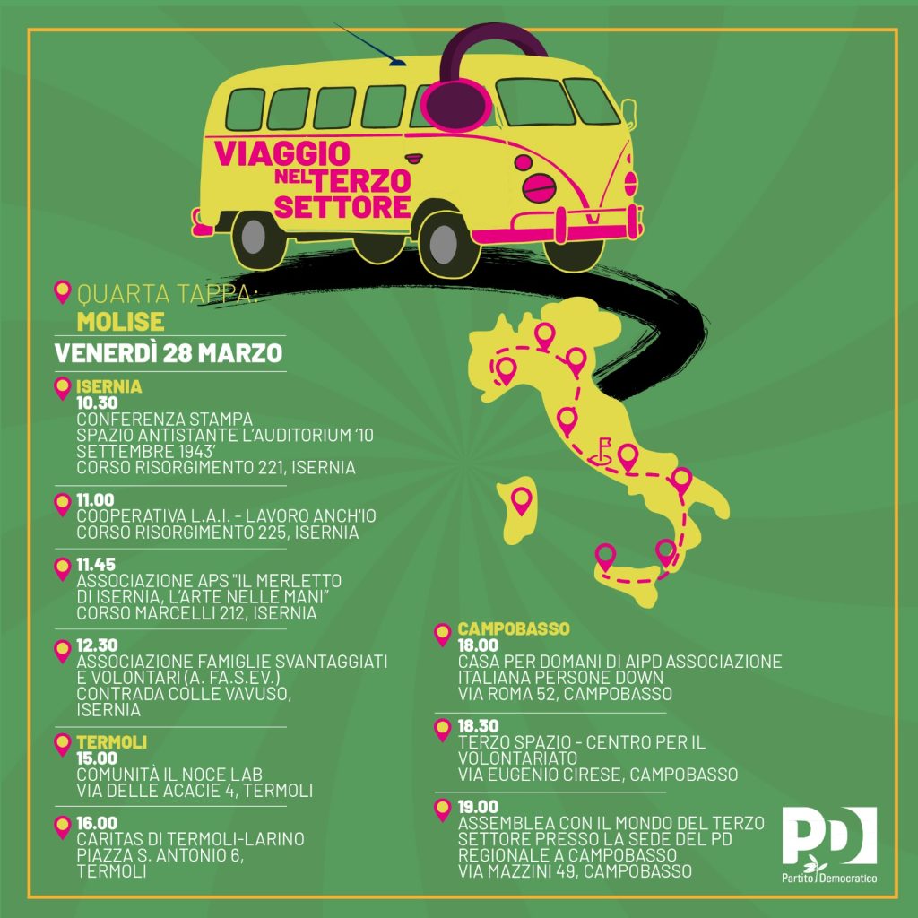 Venerdì 28 marzo 2025, il “Viaggio nel Terzo Settore” del Partito Democratico farà tappa in Molise, con una giornata di confronto e ascolto dedicata alle realtà associative, cooperative e del volontariato di tutta la regione.
