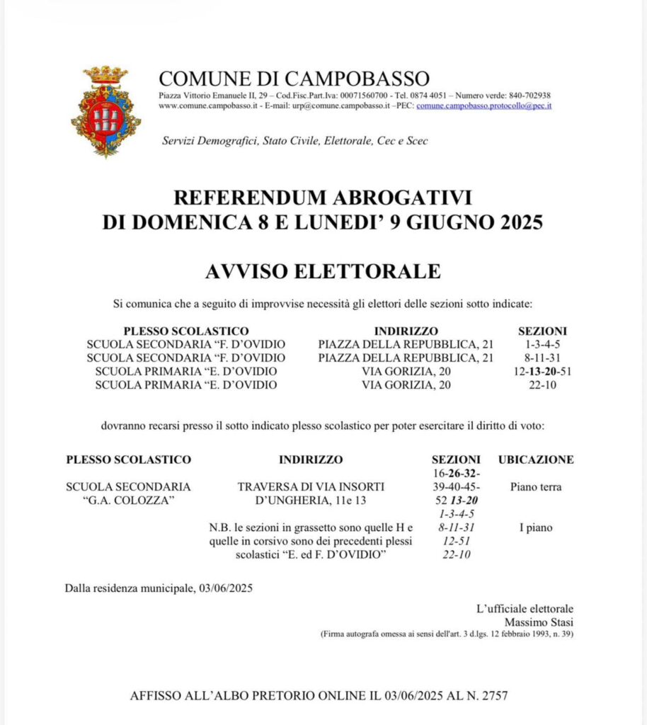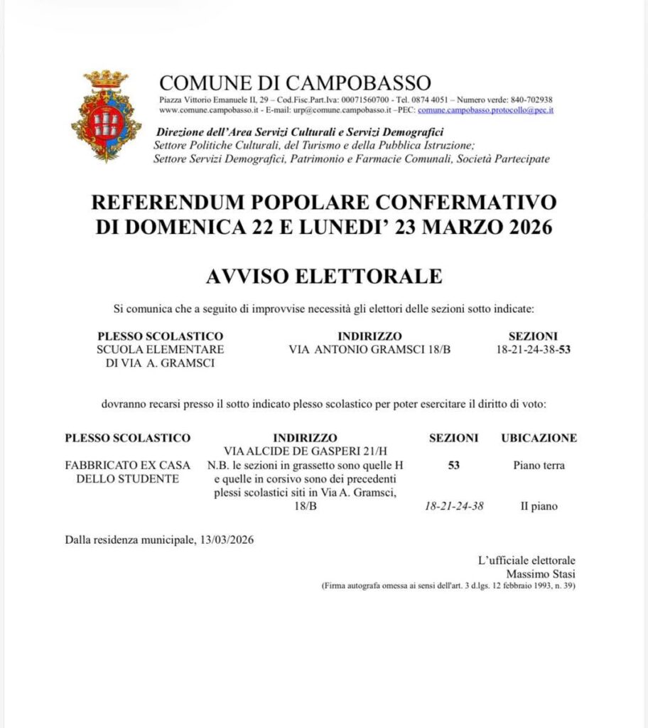 Referendum del 22 e 23 marzo 2026 – Aggiornamento sui seggi elettorali a Campobasso