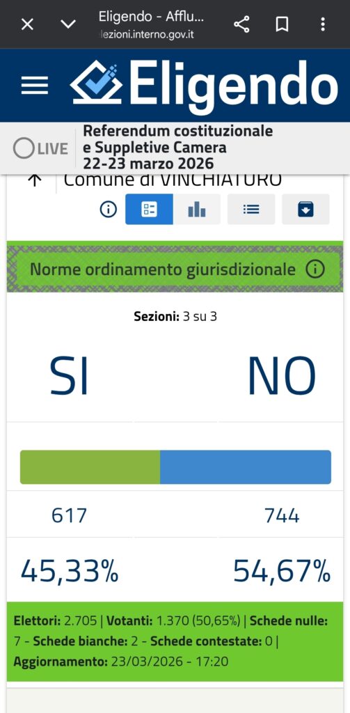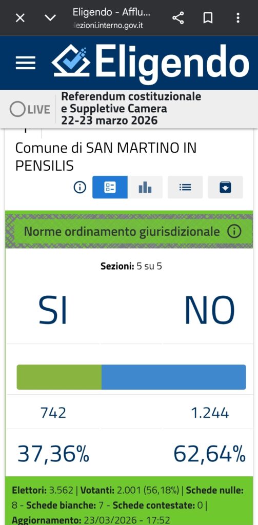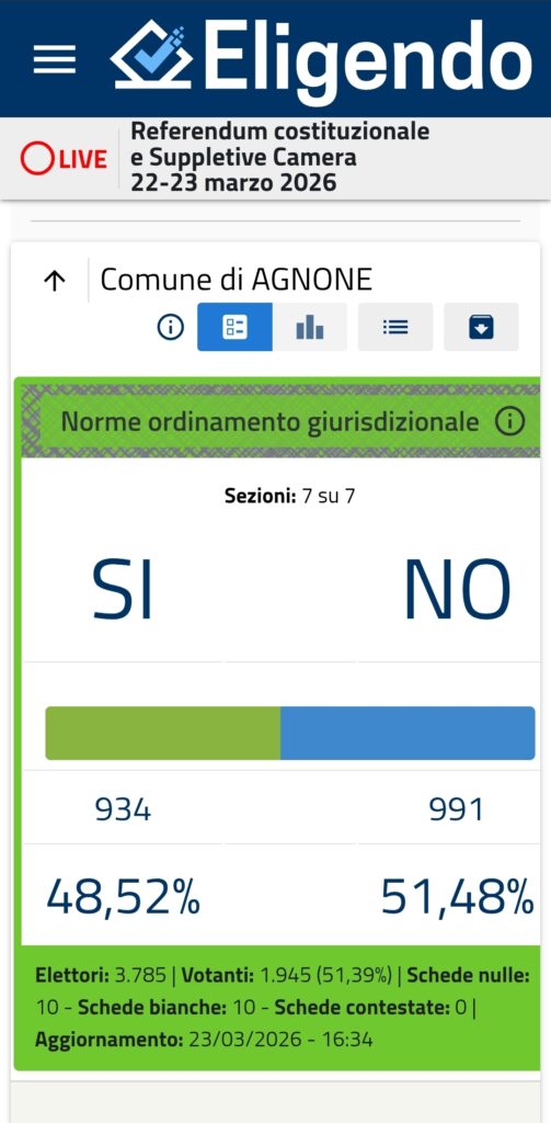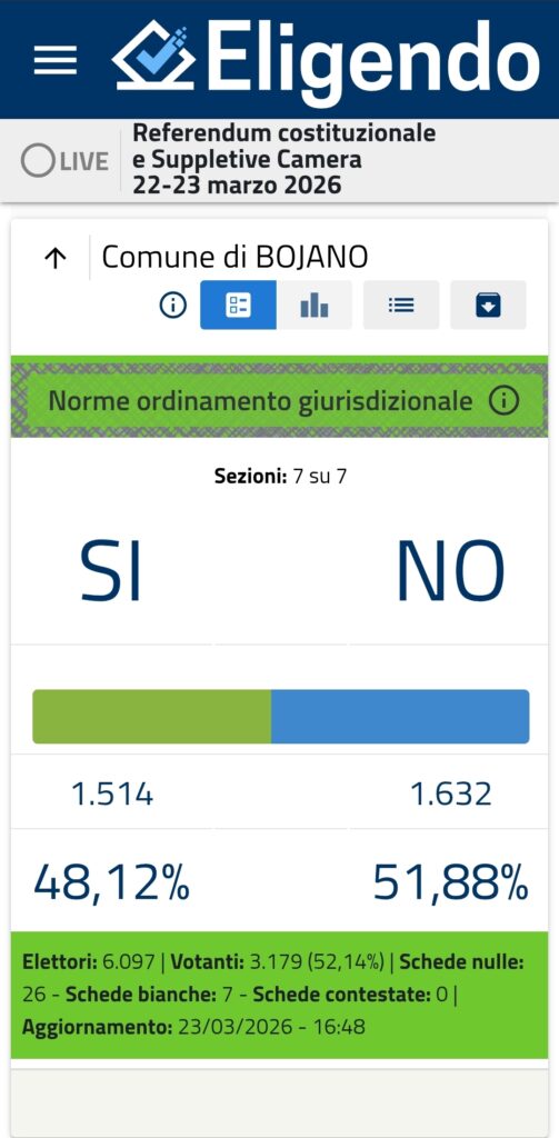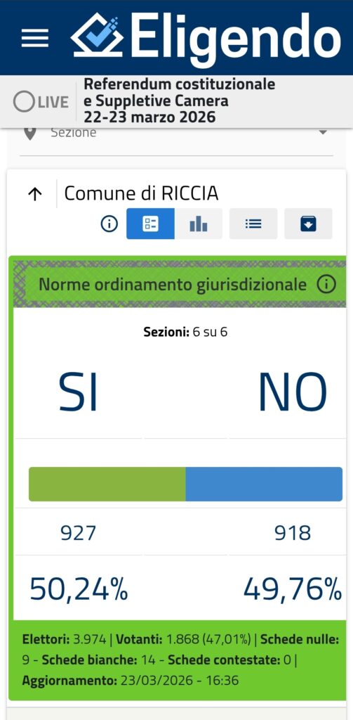 Qui è il sì a vincere con il 50,24% con un Comune praticamente spaccato a metà.