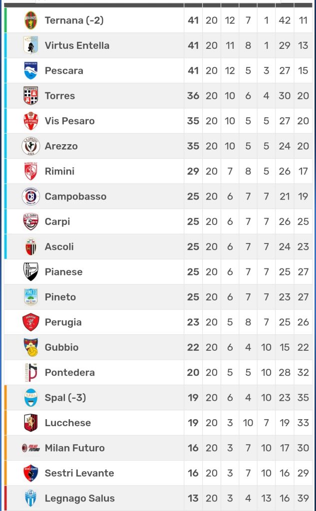Campobasso dopo la sconfitta con l’ Arezzo nella prima di ritorno della Serie C girone B resta all’ottavo posto ma si allontana di un punto dalla vetta. Condivisa da tre squadre: il Pescara e la Ternana che hanno pareggiato nello scontro diretto e l’ Entella. Arrivata anche lei a 41 punti dopo aver sconfitto a Milano la seconda squadra del club rossonero.