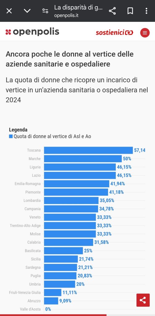 Sempre Openpolis ci fornisce una classifica tra regioni. Il Molise tra Asrem e aziende ospedaliere ha una presenza femminile del 33,3%. Vuol dire che su tre cariche apicali una sola è ricoperta da una donna.L’unica regione dove ci sono più donne è la Toscana con il 57, 14%. Perfetta parità nelle Marche con il 50%. Nelle altre regioni ovunque ci sono più uomini.Maglia nera per la Valle D’ Aosta. Nessuna delle tre cariche apicali dell’ azienda sanitaria è ricoperta da una donna. Subito dopo il tanto osannato dai molisani, l’ Abruzzo. Con un dato di 9,09% di donne.