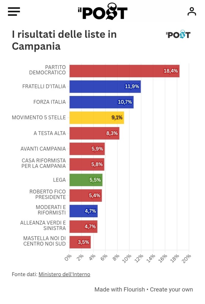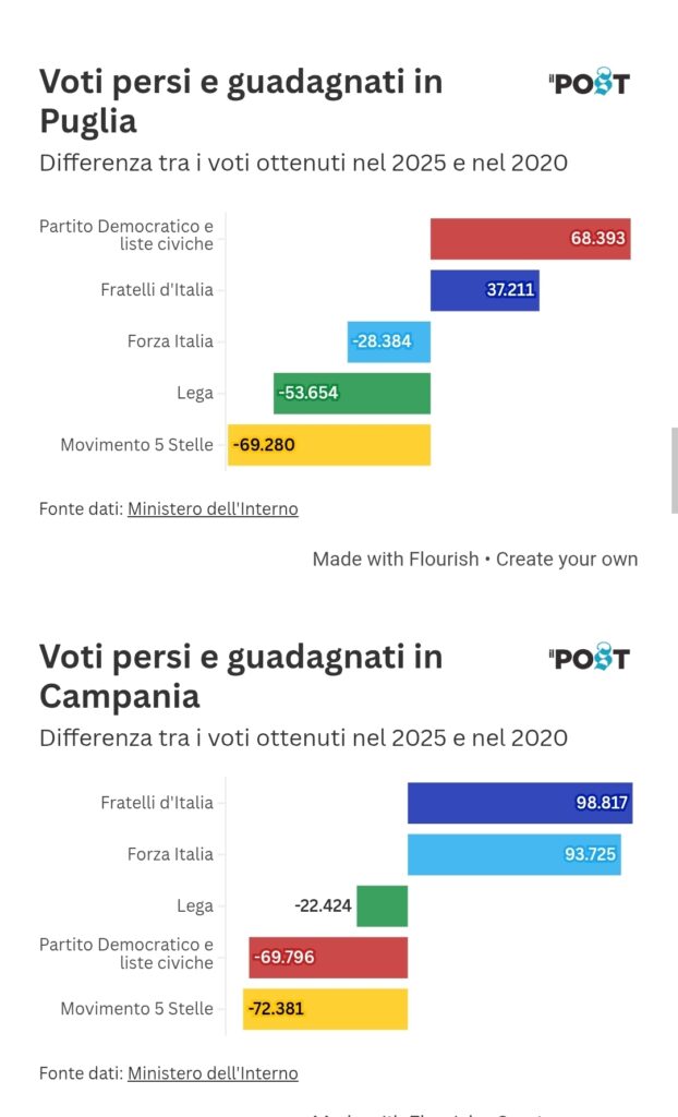 Ma ha davvero vinto le Regionali? Assolutamente no considerando che nelle regioni del Sud ha perso la metà dell’elettorato del 2020. Non dimentichiamoci della Toscana che grazie a Vannacci è passata da 8 a 1 consigliere.