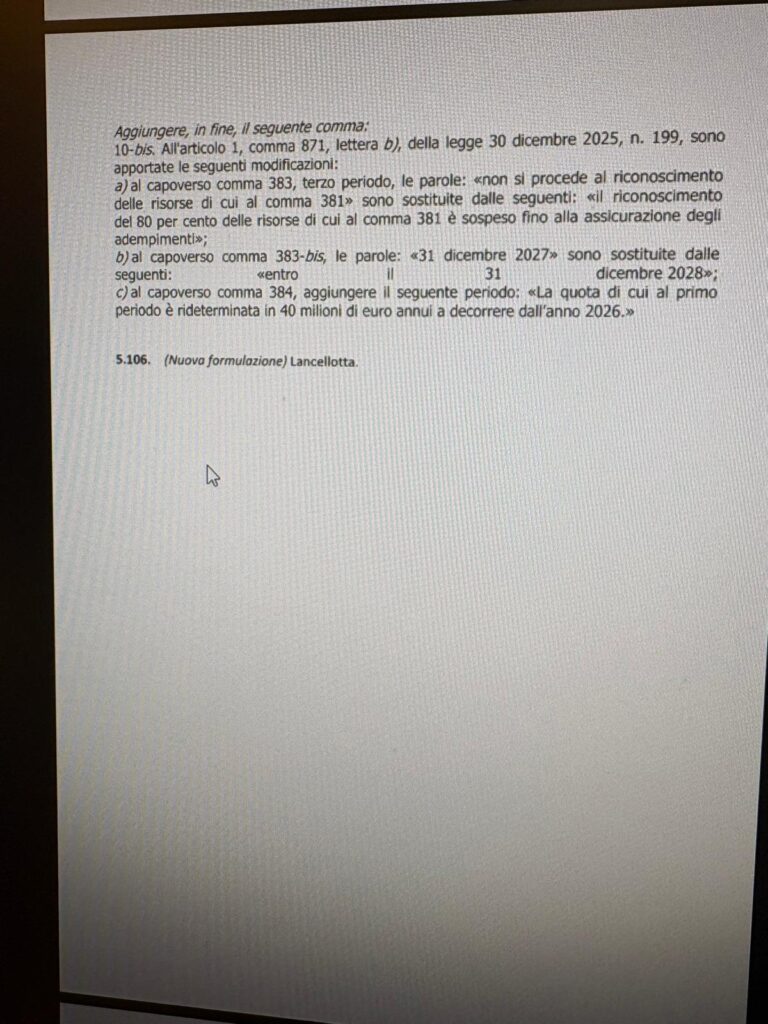 D’altronde, il testo arrivato oggi in Commissione (l’emendamento Lancellotta revisionato: all. 2) e accantonato alle 14:00, risultava persino peggiorativo rispetto alle già critiche condizioni di partenza della prima versione. Il contributo statale scendeva da 90 a 80 milioni di euro: dieci milioni fondamentali persi in un istante. Inoltre, sempre in quella proposta non passata, la scadenza per il ripiano del deficit residuo veniva accorciata al 2028 anziché al 2029.
