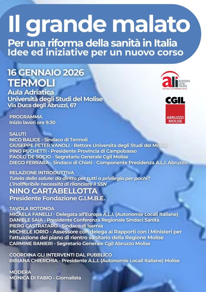 Il suo nome è presente in un incontro che si svolgerà il 16 gennaio a Termoli dal titolo “Il Grande malato” incontro voluto da Ali e Cgil al quale saranno presenti molti personaggi del Pd e del centrosinistra molisano.