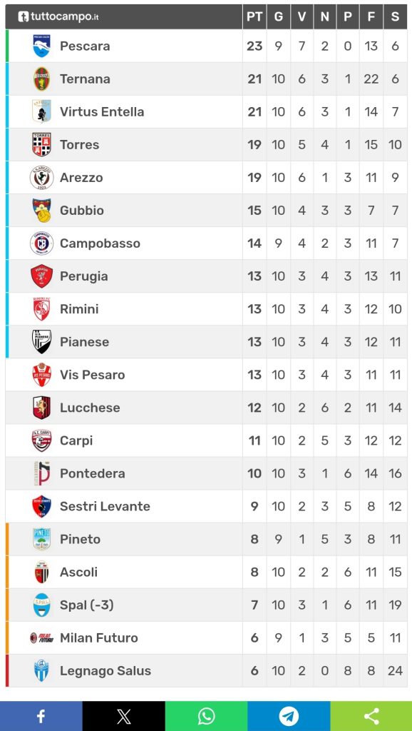 Serie C girone B, la classifica dopo la decima giornata prima della sfida del Campobasso