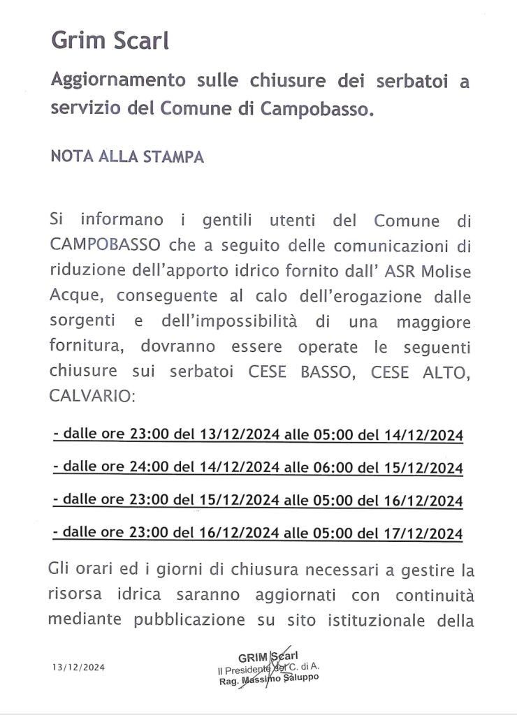 Campobasso, ecco i serbatoi che resteranno chiusi fino a martedì 17 dicembre
